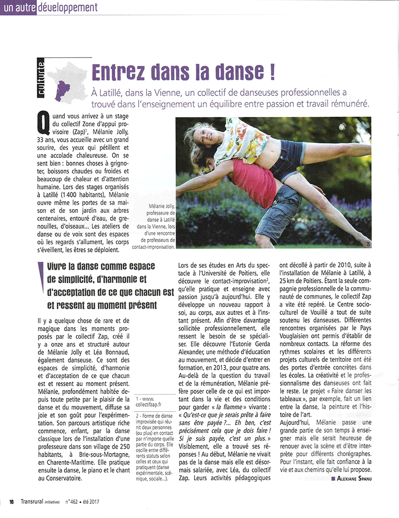 Elle est à l’origine du Collectif Zone d’Appui Provisoire, et c’est au sein de cette compagnie qu’elle développe de plus en plus son travail, aussi bien en tant que danseuse, chercheuse en mouvement, qu’en tant que pédagogue.